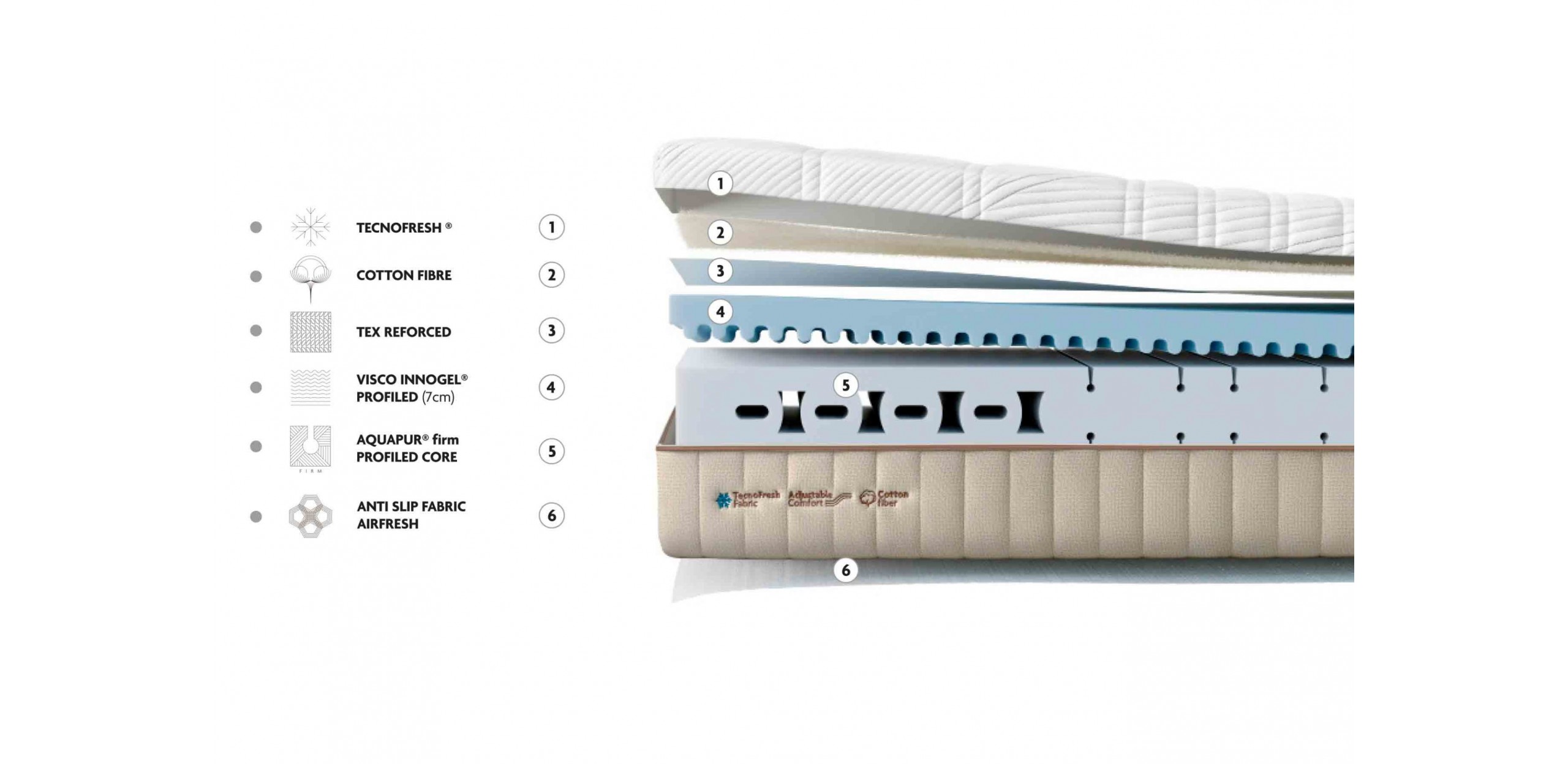 3) "TEX Reforced" - neaustinė medžiaga, stabilizuojanti vidinius čiužinio sluoksnius.