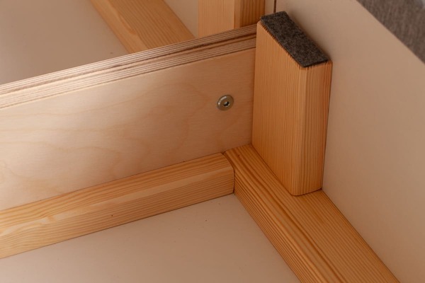 Lovos rėmas pagamintas, kombinuojant 18mm storio daugiasluoksnę fanerą, medieną ir tankią laminuotą drožlių plokštę.