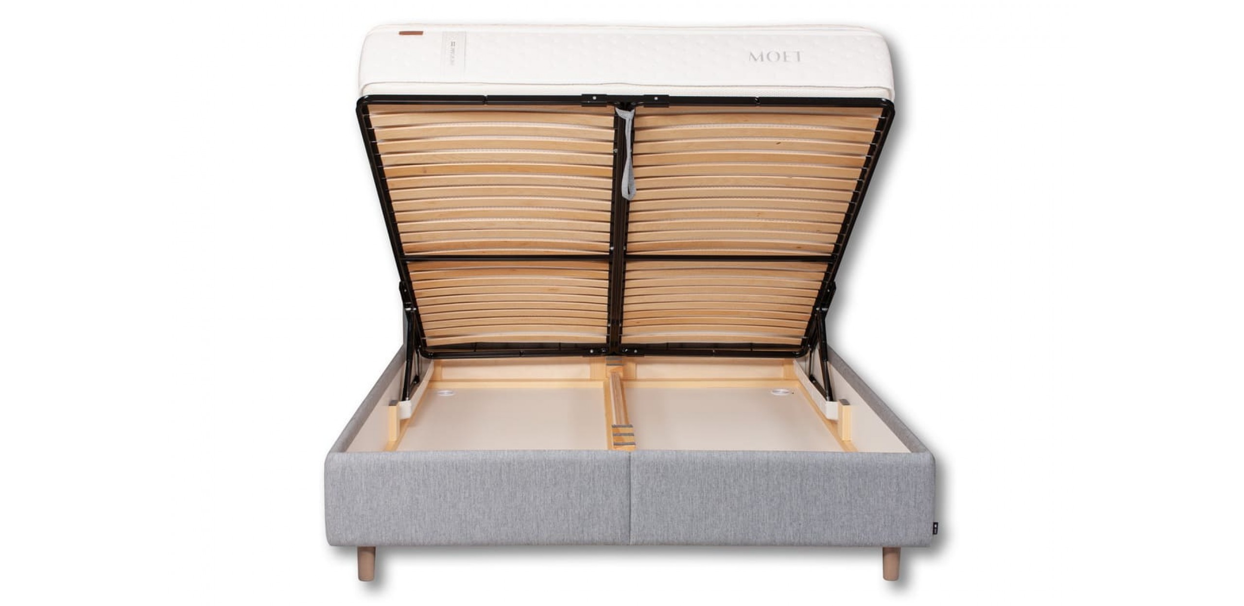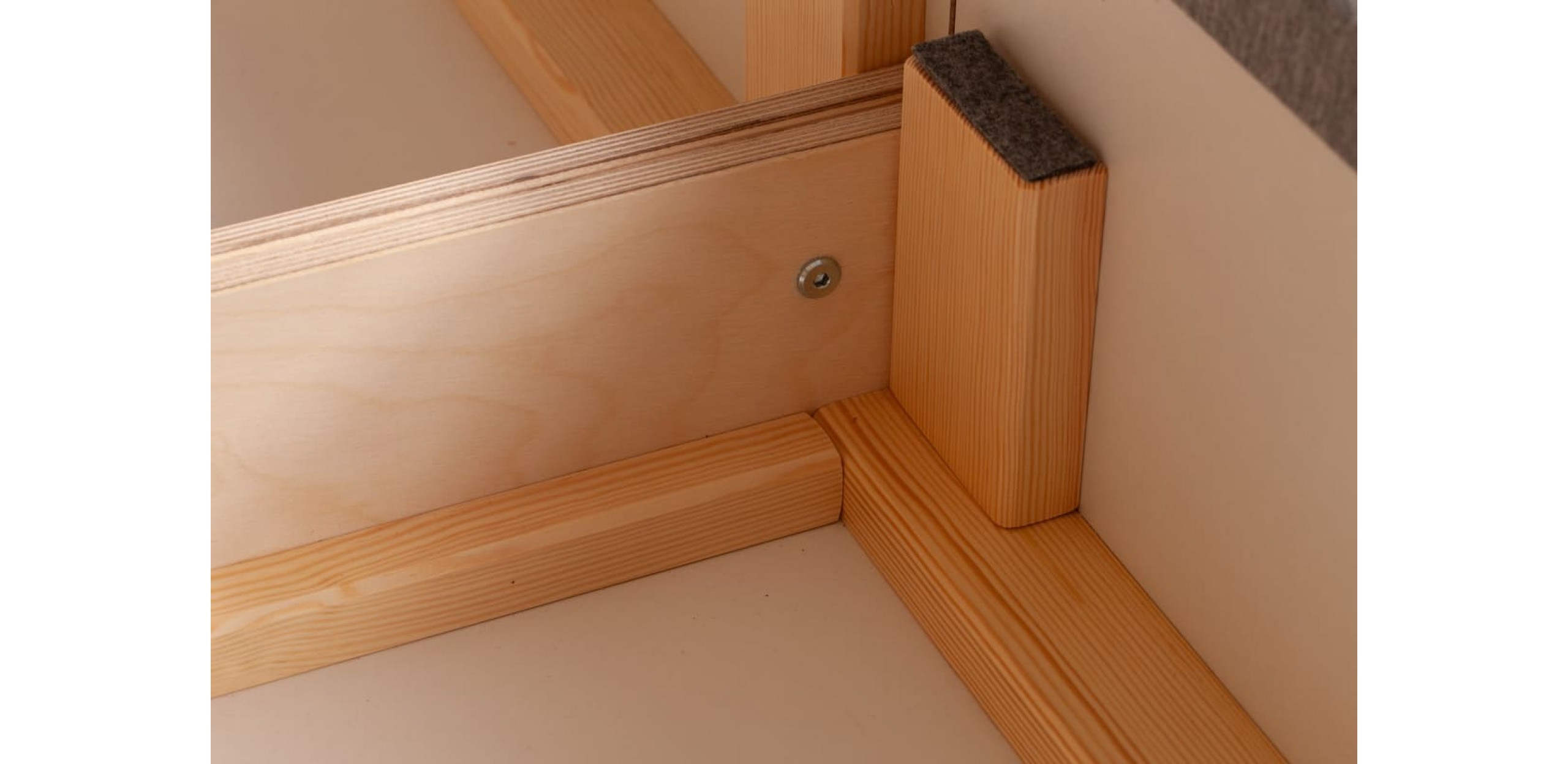 Lovos rėmas pagamintas, kombinuojant 18mm storio daugiasluoksnę fanerą, medieną ir tankią laminuotą drožlių plokštę.